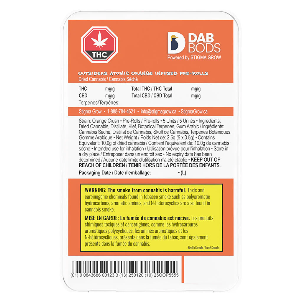Get ready to ignite your senses with Dab Bods Outsiders Atomic Orange Infused Pre-Rolls! Infused with premium distillate and enriched with botanical terpenes then coated in kief for and extra kick, these pre-rolls offer a burst of flavor. Each pack contains 5x0.5g pre-rolls, expertly crafted to deliver a smooth and satisfying experience. Featuring the renowned Orange Crush strain, these pre-rolls tantalize your taste buds with the sweet, zesty flavor of fresh oranges. Perfect for any occasion, whether you're enjoying a sunny day outdoors or relaxing at home, the Atomic Orange pre-rolls ensure a vibrant experience. Dive into the deliciousness of Atomic Orange -where every puff is a juicy celebration!