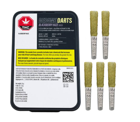 Up your game with DEBUNK Triple Infused Blackberry Haze Darts, a fresh Indica to level up your afternoon or evening. Grounded by a citrus base and rich berry overtone, this 5-pack of darts are Bubble Hash coated and infused with THCa, Liquid Diamonds, and botanical terpenes for maximum flavour and potency. With high-quality milled flower in a classic 0.5 g format, this cross between Blackberry and Lime Haze comes in at 40% THC, delivering a pack of bold, premium pre-rolls built to hit harder.