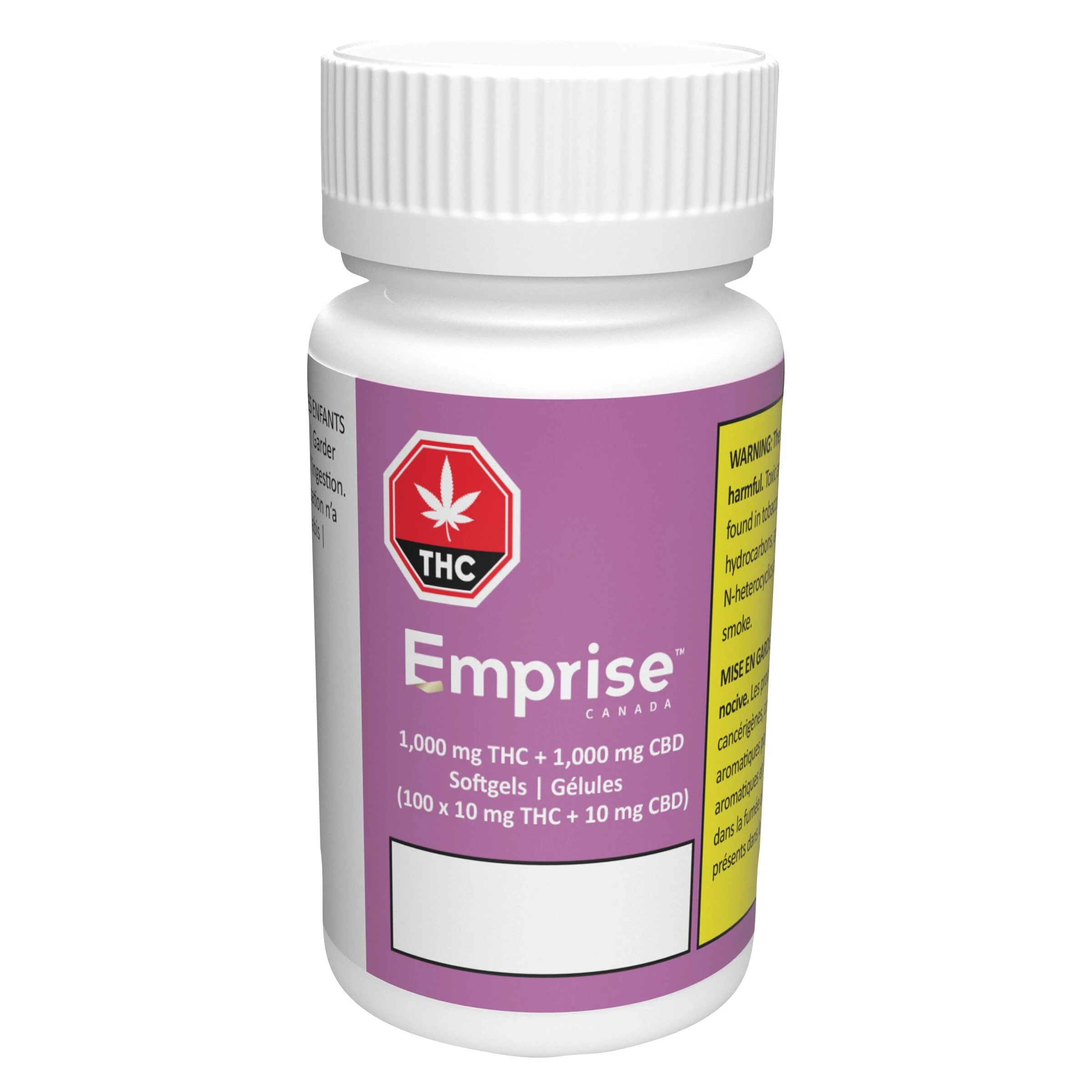 Emprise's 1,000 mg THC + 1,000 mg CBD Softgels ( 100 x 10 mg THC + 10 mg CBD) contains 100 softgels. Offering Consumers the Maximum Potency of 1000 mg THC:CBD avilable in Canada. Each softgel has 10 mg THC:CBD. The product is formulated with hemp seed carrier oil which supports the Entourage effect. Making this product the first true-to-plant softgel on the market - After all if it grows together, it goes together.