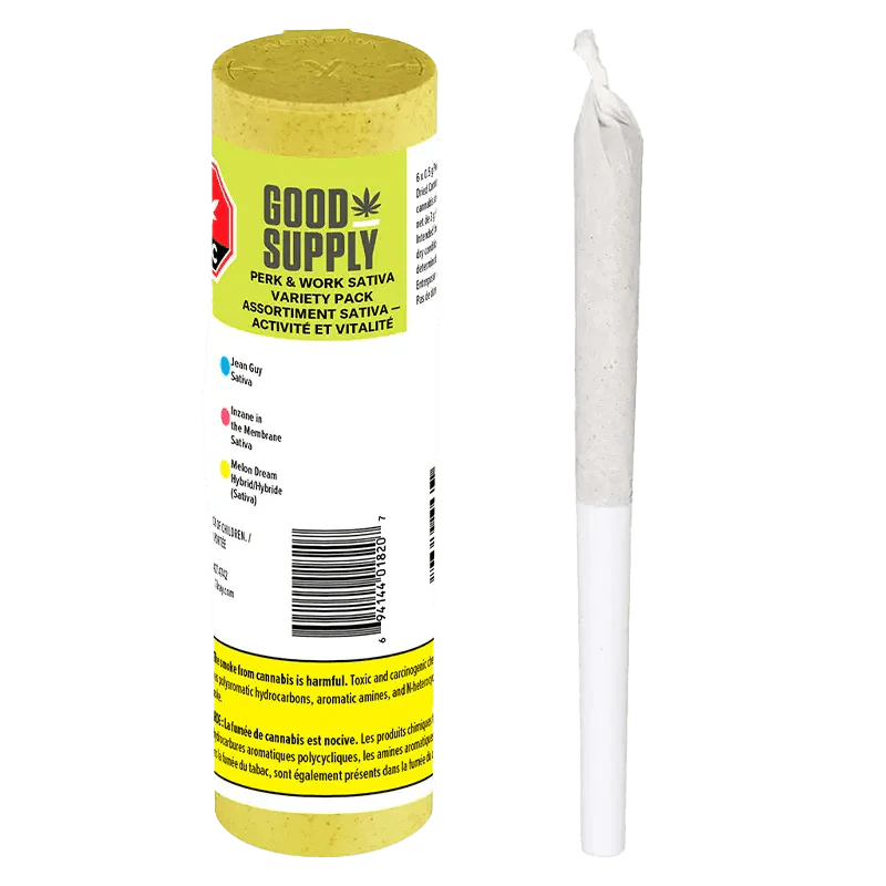 Get $#!% done and have a little fun with Perk & Work Sativa Variety Pack Pre-Rolls. We put together a selection of our finest sativas, at 18-24% THC, that are down for any uplifting and energetic adventure. Get a six-pack of pre-rolls with two 0.5g cones of each stimulating sativa strain: Jean Guy's iconic lemon, new Inzane in the Membrane's explosive citrus and new Melon Dream's fresh fruity flavour. Whether you're sharing, can't decide, or are just a variety aficionado - this all-star, all-sativa line-up of tasty pre-rolls is the bright call.