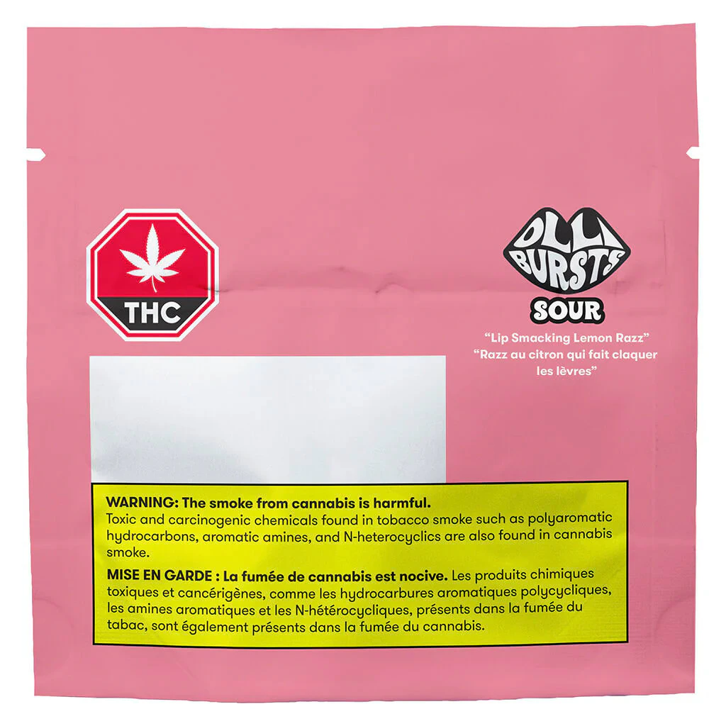 Olli Bursts 'Lip smacking Lemon Razz' deliver a delightful combination of fruity sweetness and zesty tartness. The contrast between the raspberry gummy and the lemonade liquid center, creates a mouth-watering and refreshing taste experience. This snack is perfect for various occasions, especially snacking while on the move. Olli Bursts 'Lip smacking Lemon Razz' are made with natural raspberry and lemonade flavours, providing a delightful surprise as you bite into it. Each pouch contains two 6g soft chews, infused with 5 mg THC per chew for a total of 10 mg THC per package.