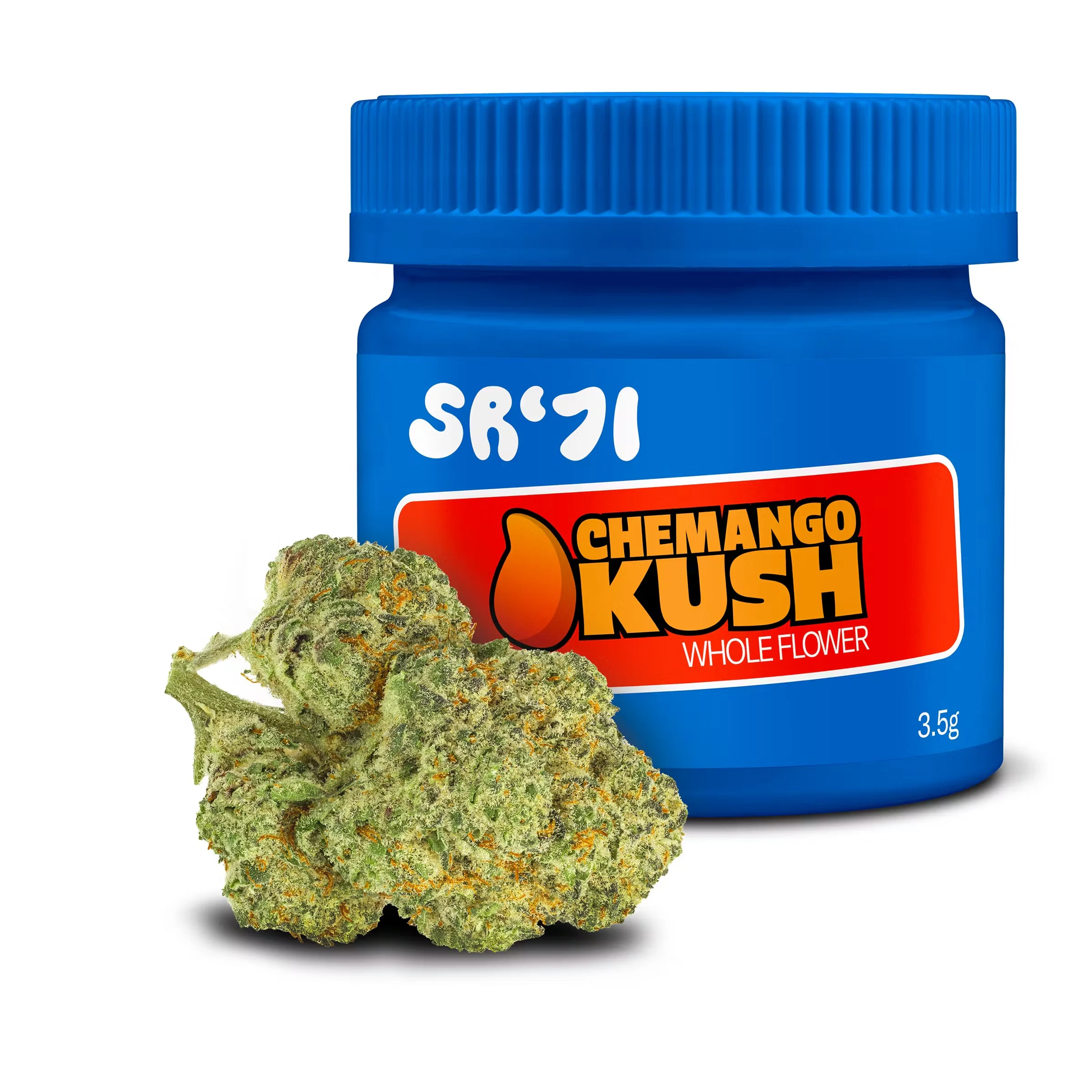 Chemango Kush by San Rafael '71 is a premium, indoor-grown strain bred from premier genetics from a world-class breeding facility in Comox, British Columbia. A next-generation cultivar, Chemango Kush was bred to deliver high THC potency and an intriguing blend of fruit, sour, and chem aroma notes. This powerful indica features huge, ultra-dense buds with gorgeous olive-green tones and glistening trichomes. Chemango Kush is hang-dried, hand-finished, and carefully hand-bottled with an included humidity pack.