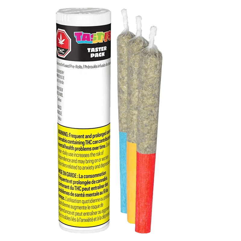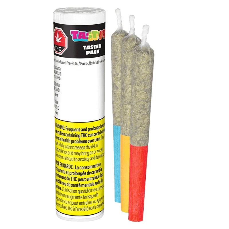 Can't settle on one flavour? With TASTY'S Taster Pack, you won't have to. This variety pack features 3 of our most mouth-watering, lip-smacking flavours: Blue Raspberry, Honeydew, and Mango. Each infused pre-roll clocks in at 50% THC-thanks to a potent blend of whole milled flower infused with ultra-powerful THC-A diamonds. The incredible flavour? It comes from 100% all-natural botanical terpenes. It's all there: maximum taste, maximum THC in one irresistible multi-pack.
