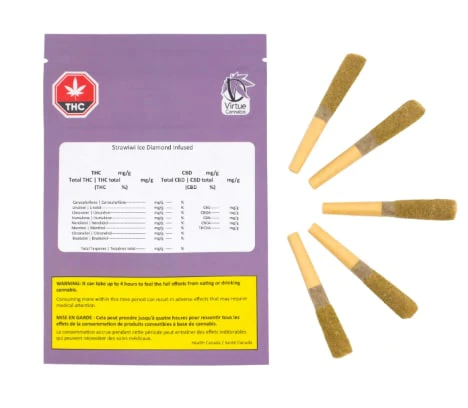 What do you get when you blend the essence of fresh sweet strawberry, tart tangy kiwi, and crisp cool ice? Strawiwi! We've infused our premium whole flower with exquisite THCa diamonds and the refreshing icy twist for the fresh taste of beaches, patios, and summer dreams! With a luxurious coat of golden kief, our infused pre-rolls boast a crisp smooth smoke bursting with fruit flavour and a cool icy finish. What could be be more tasty tasty than Strawiwi?